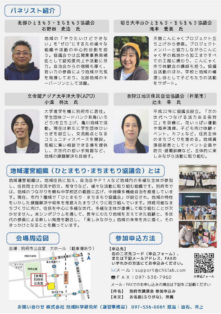 基調講演では、まちづくりの実践に詳しい講師をお迎えし、パネルディスカッションでは、実際に地域で活動されている皆さんと一緒にこれからの別府、これからの地域の可能性について語り合います。